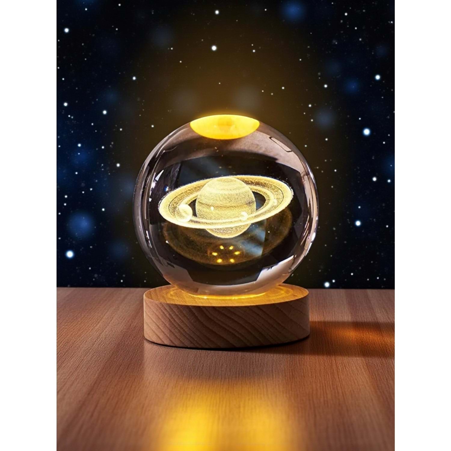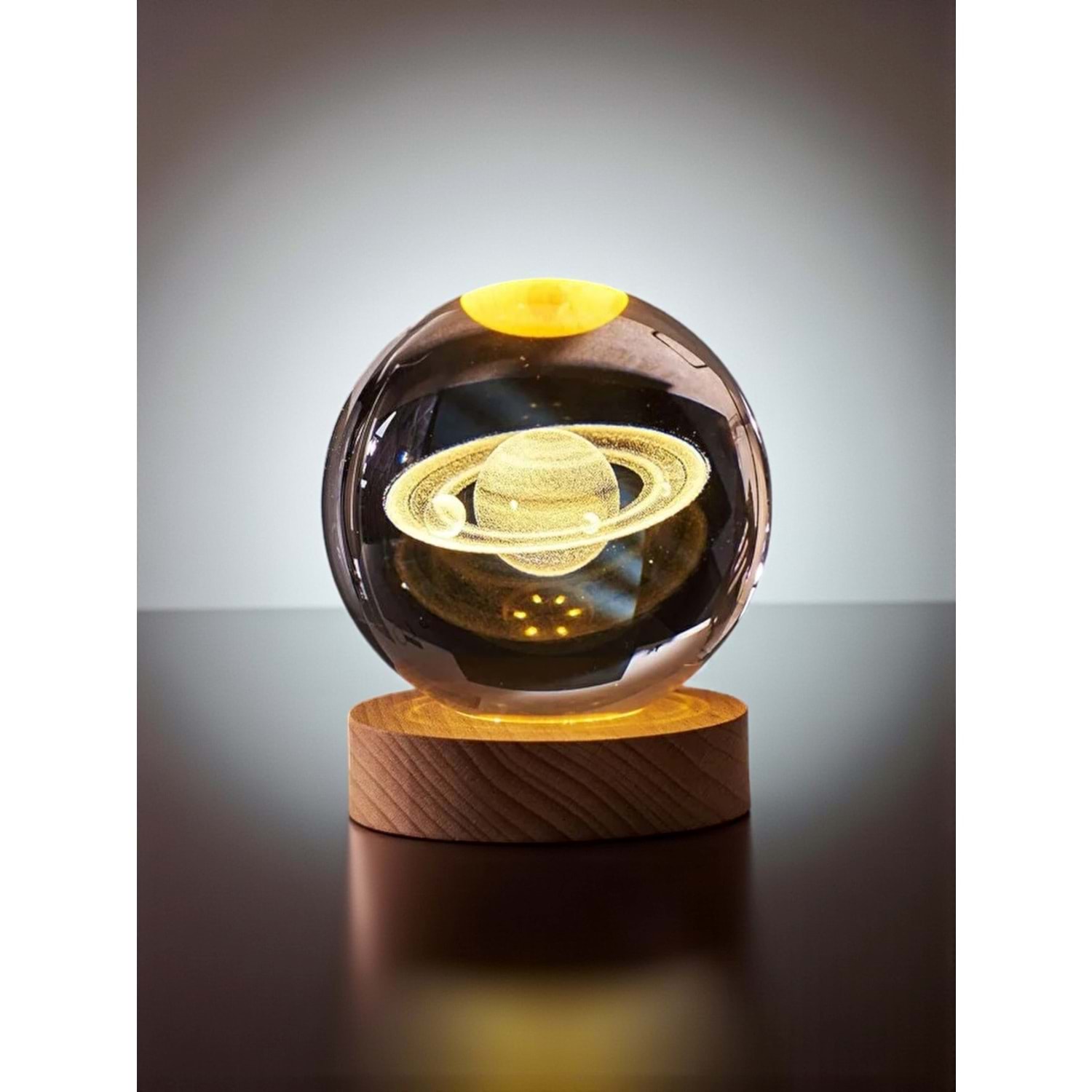 Mistik Satürn Teması: Küre içinde yer alan 3D lazer işlemeli Satürn figürü, ışık yandığında büyüleyici bir görsel şölen sunar. (SEO: Satürn Küre Lamba, 3D Gece Lambası, Uzay Temalı Dekor)