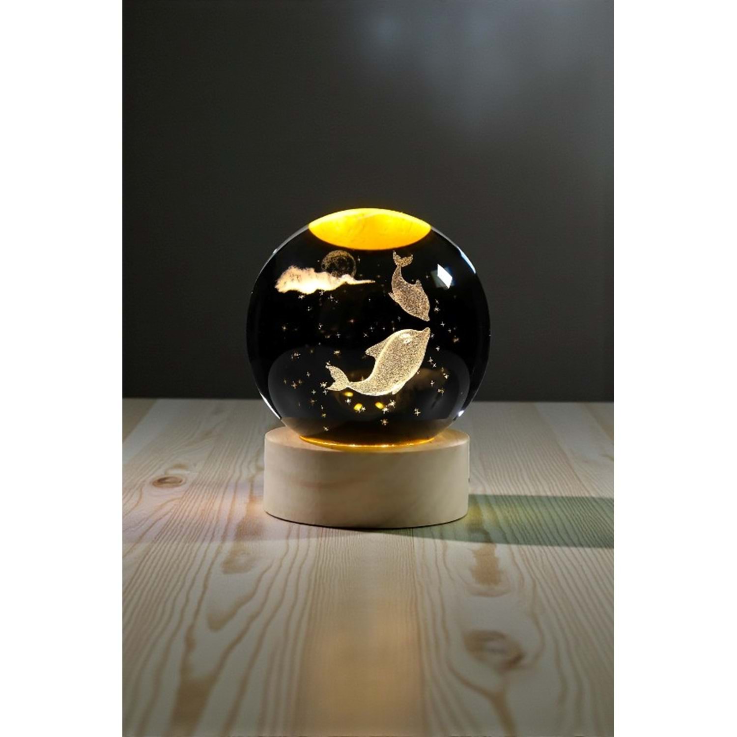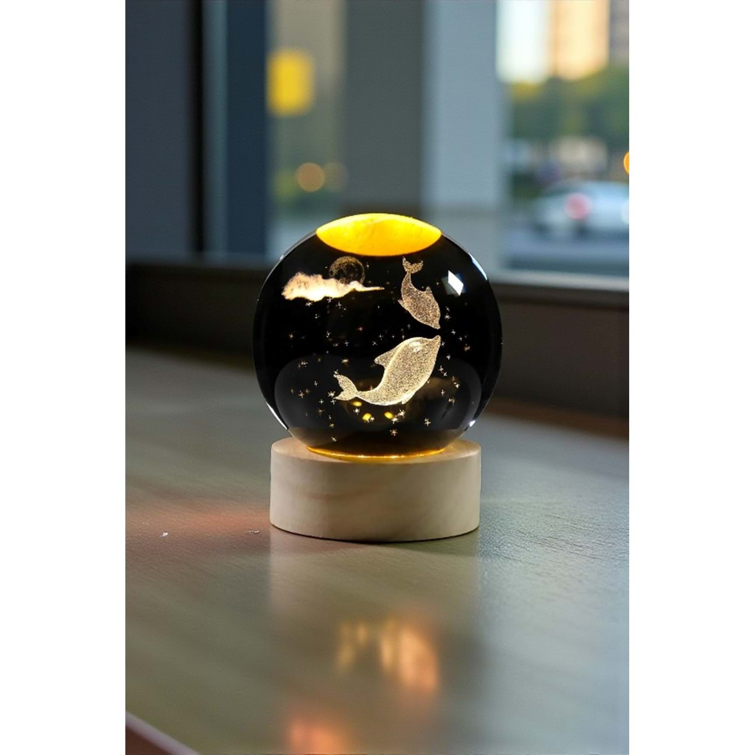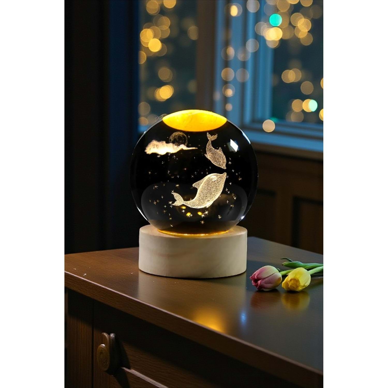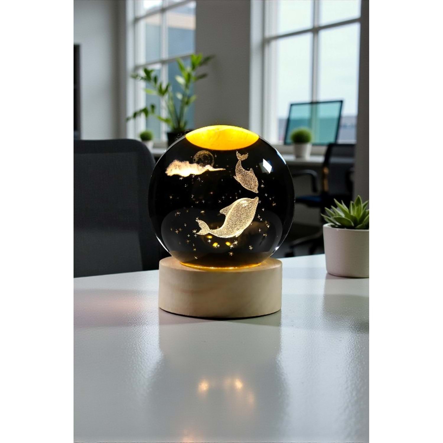 Sevimli yunus balıkları tasarımlı 3D lazer işlemeli cam küre, ahşap kaidesi ve yumuşak LED ışığıyla hem dekoratif hem de aydınlatıcı bir aksesuar sunar.