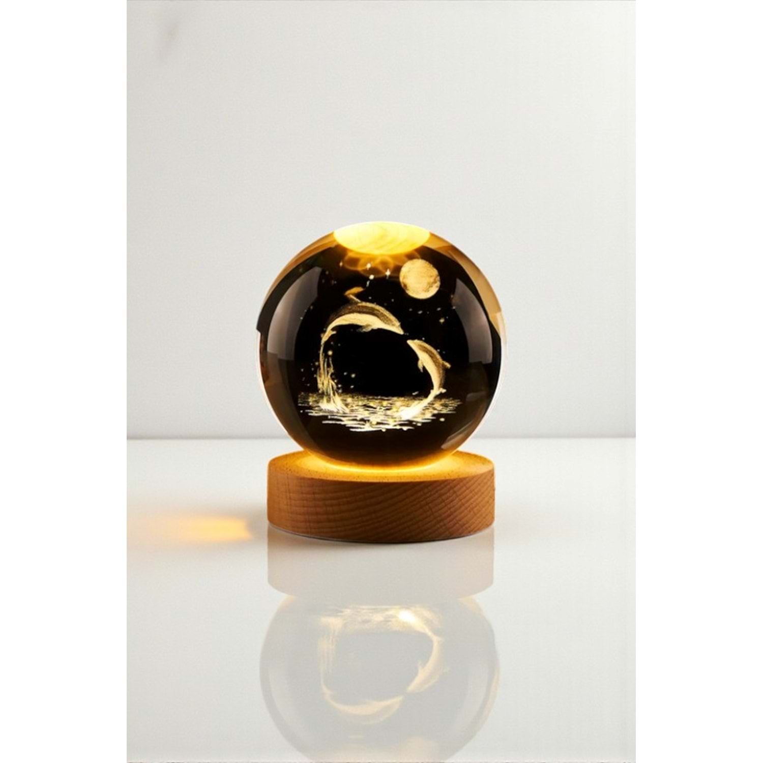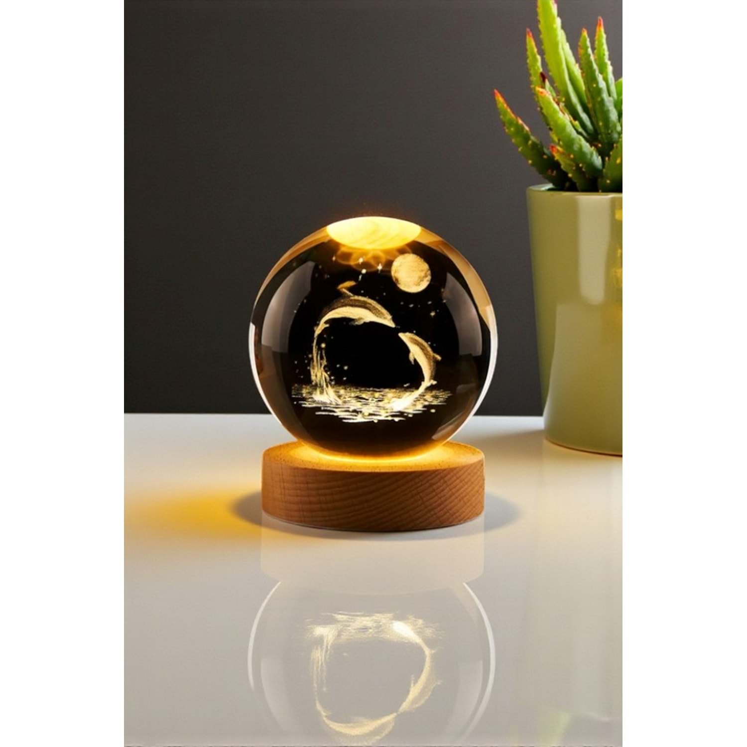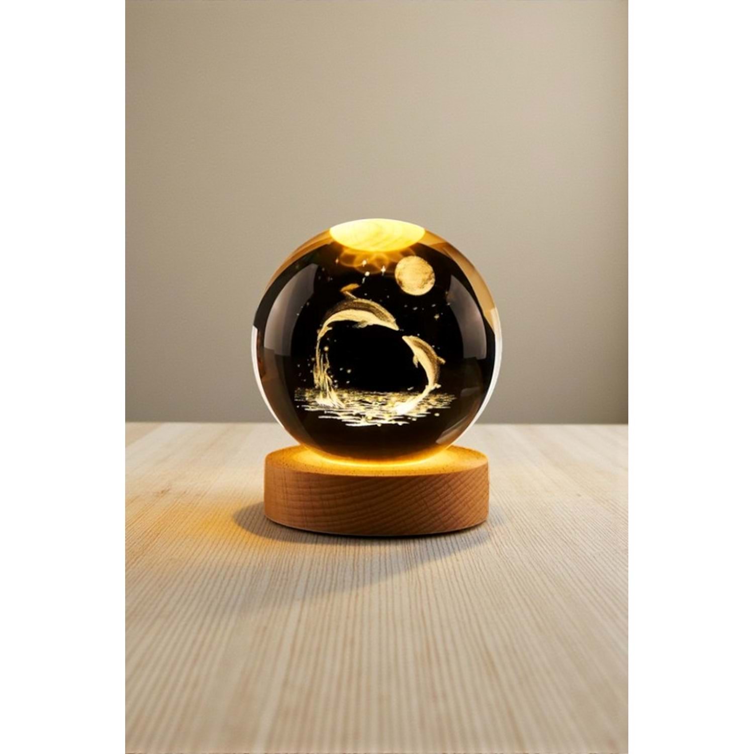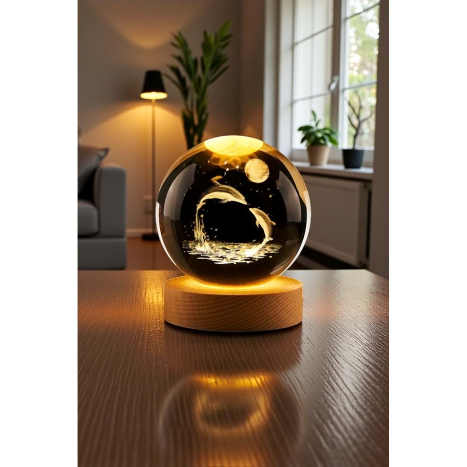 Sevimli yunus balıkları tasarımına sahip bu 6 cm 3D lazer işlemeli cam küre, ahşap altlığı sayesinde hem doğal hem de modern bir görünüm sunar.