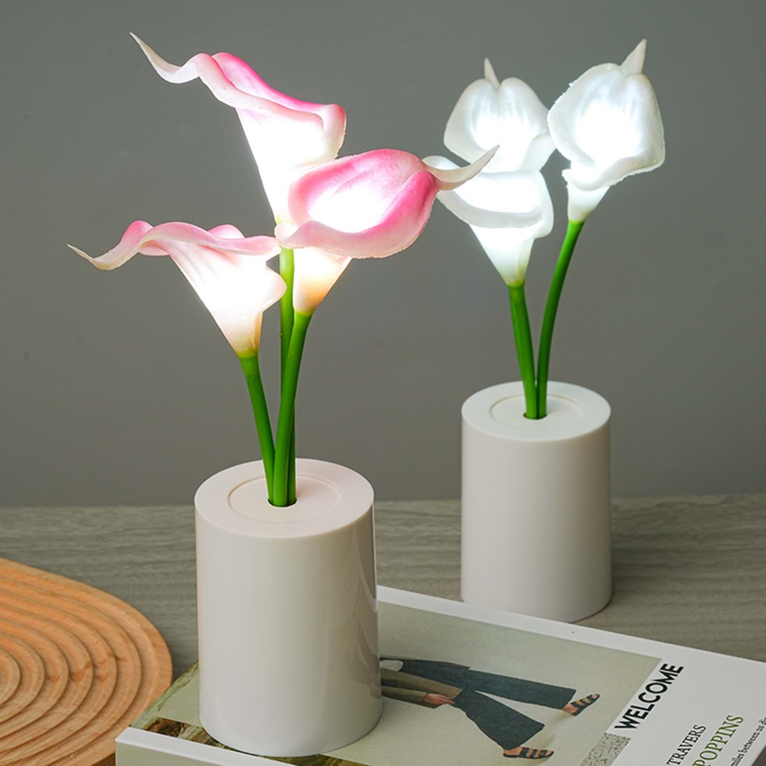 Aydınlatma Zambak çiçeklerinin ve yapraklarının arasına özenle yerleştirilmiş LED ışıklar ile aydınlatılır. Işık, genellikle yumuşak ve sıcak beyaz (gün ışığı) tonunda yayılarak sakin, huzurlu bir gece lambası ambiyansı oluşturur.