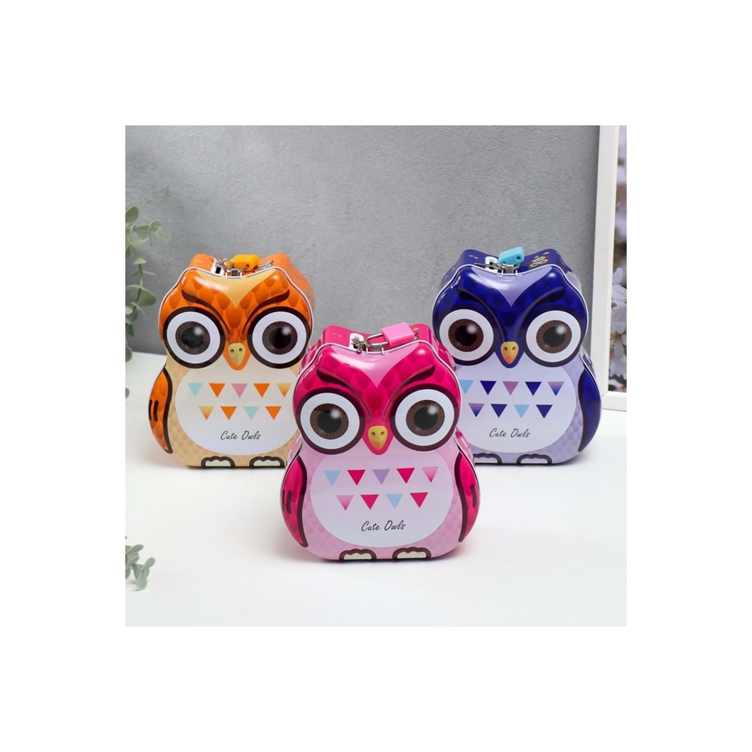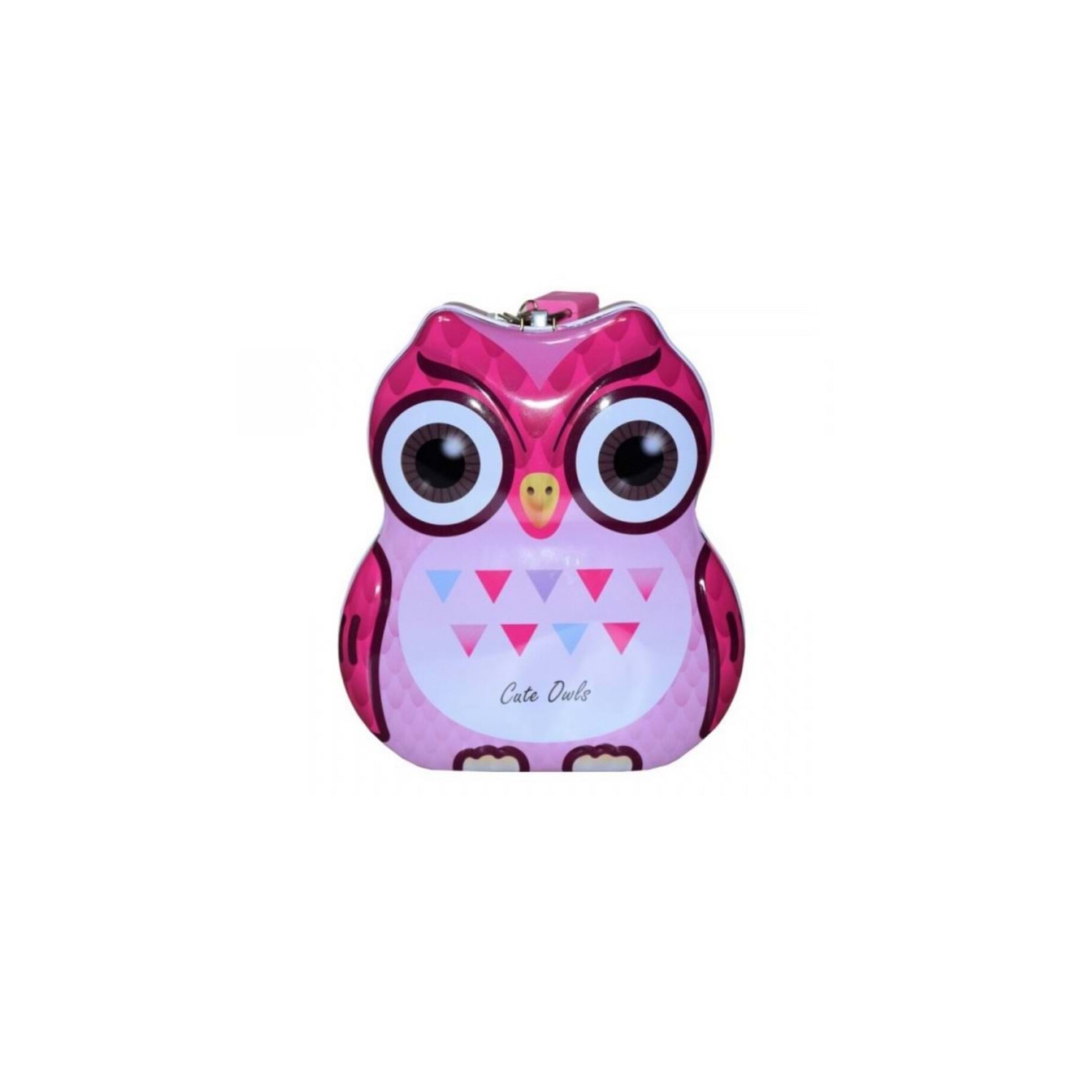 Sevimli Baykuş Tasarımlı Kilitli Metal Kumbara – 15x13x7 cm, Renkli