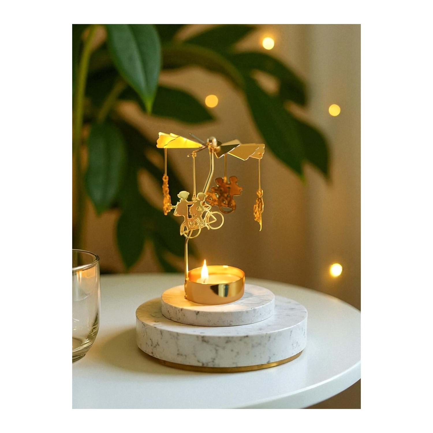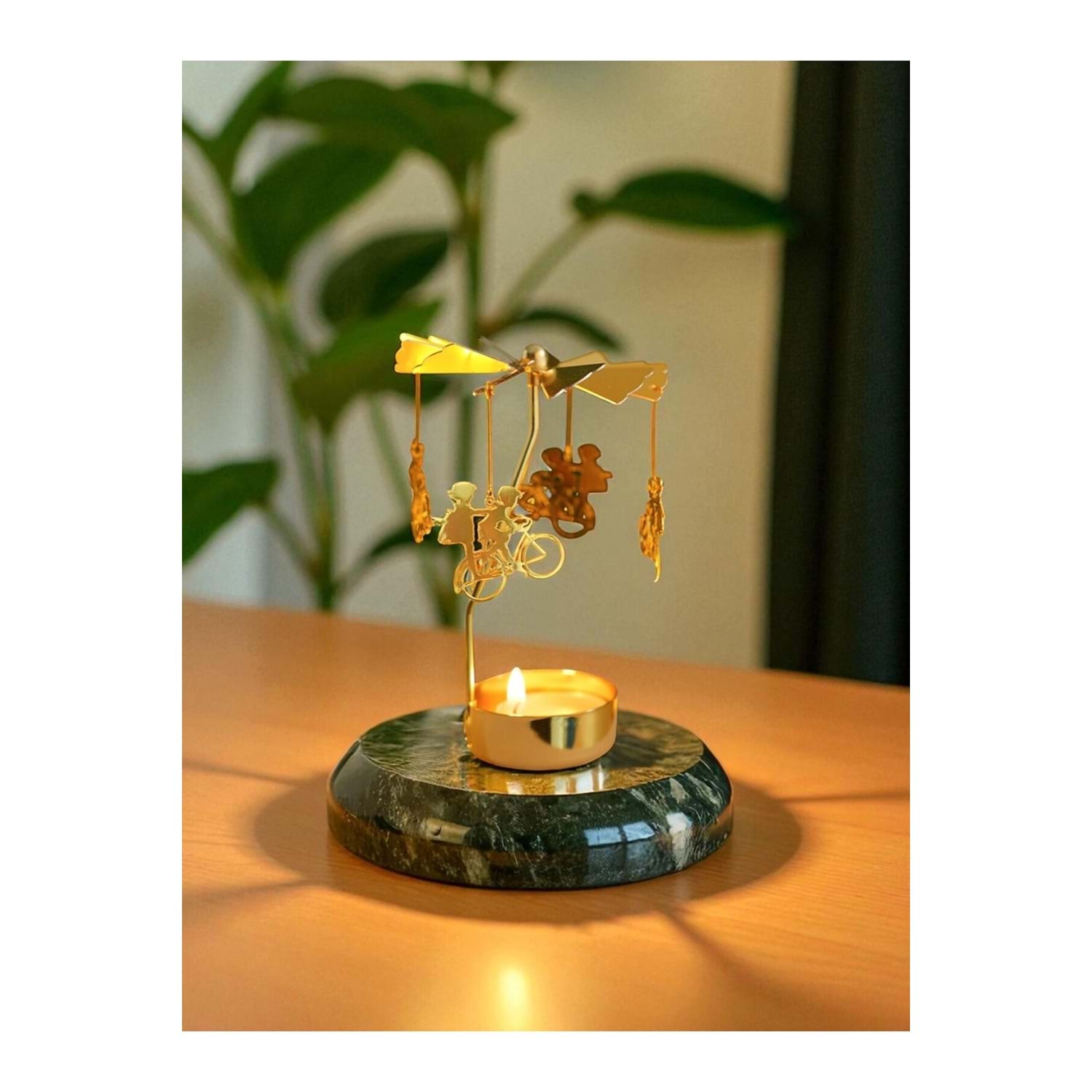 Isı İle Dönen Mumluk – Bisiklet Süren Arkadaşlar Modeli, Altın Renk, Dekoratif Metal Masa Üstü Mumlu