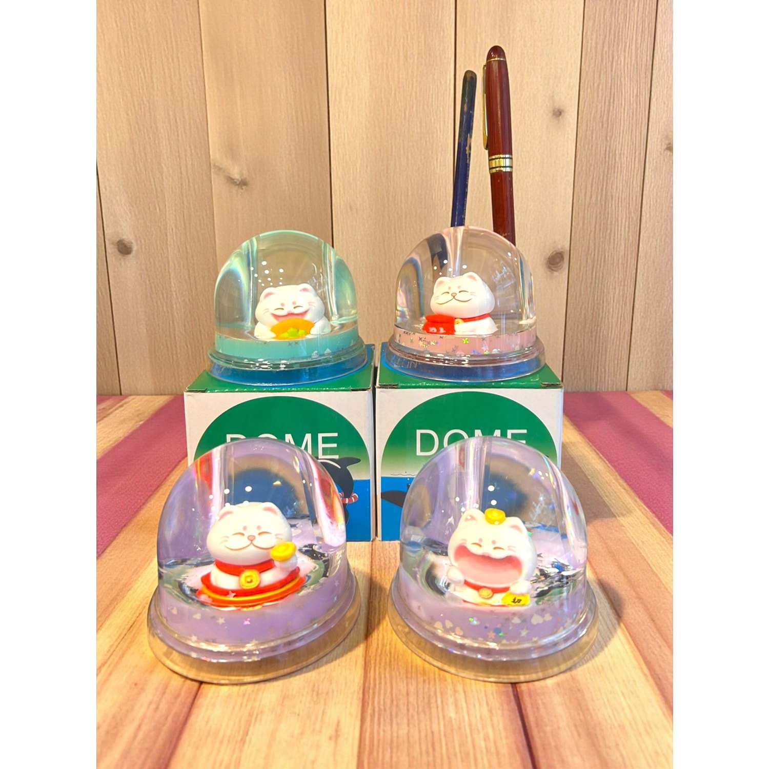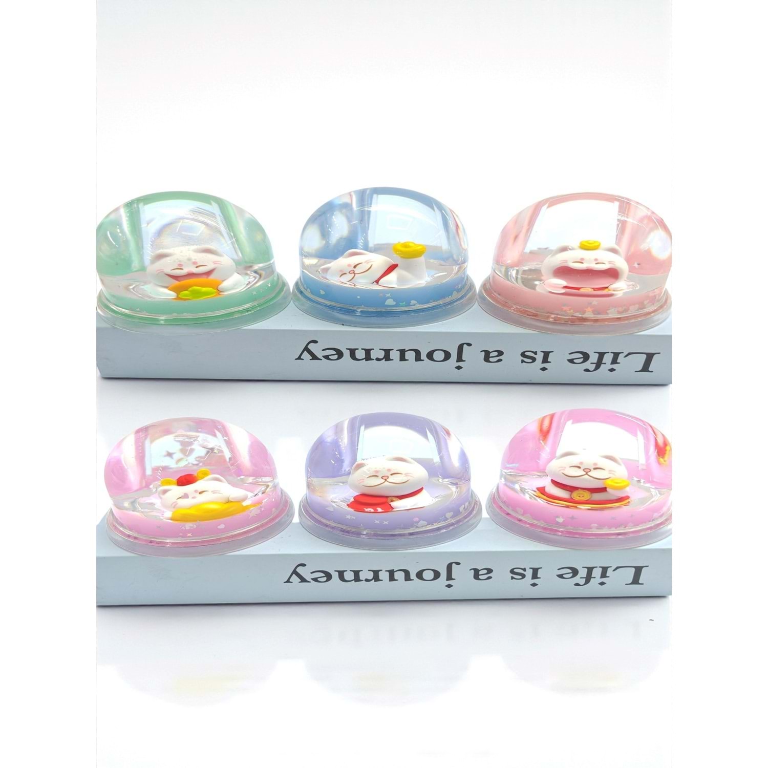 Bu sevimli Şans Kedisi (Maneki-Neko) Tasarımlı Sulu Kalemlik, kalemlerinizi düzenlemekle kalmaz, aynı zamanda geleneksel bir uğur objesi ve sakinleştirici bir masaüstü dekordur. Şeffaf kubbe içinde bulunan renkli sıvı ve parıltılı yıldızlar, hafifçe sallandığında Şans Kedisi figürünün etrafında süzülerek görsel bir terapi sunar.