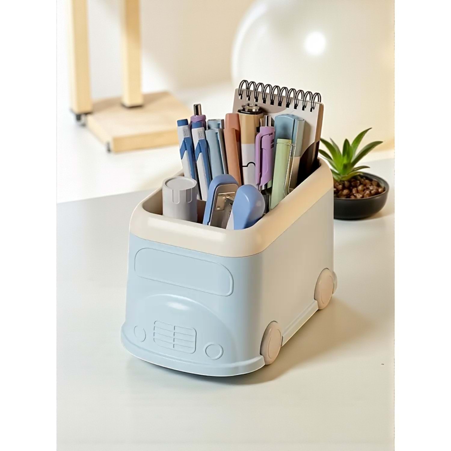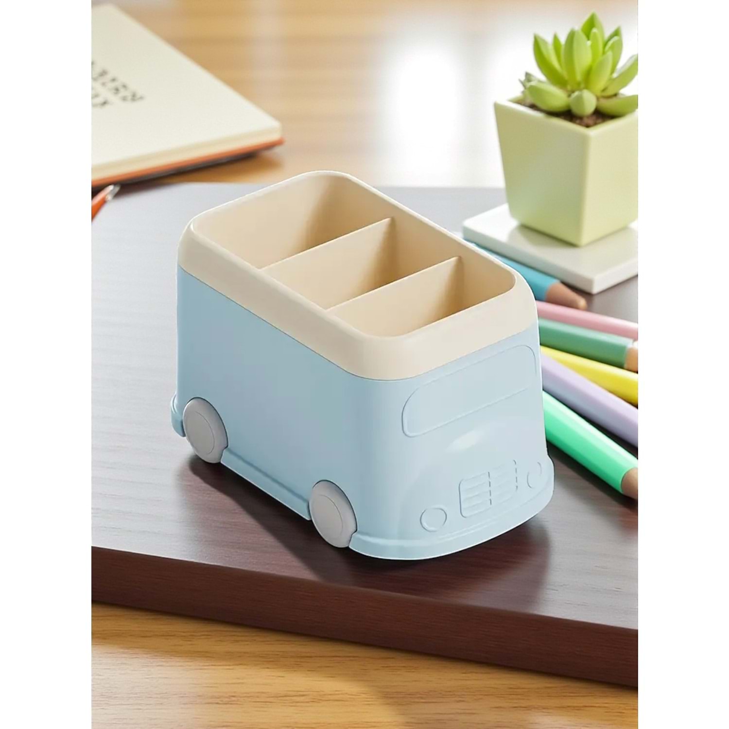 Otobüs Tasarımı: Sevimli tekerlek detayları ve otobüs formundaki yapısıyla çalışma motivasyonunu artırır. (SEO: Otobüs Kalem Kutusu, Sevimli Ofis Dekoru)