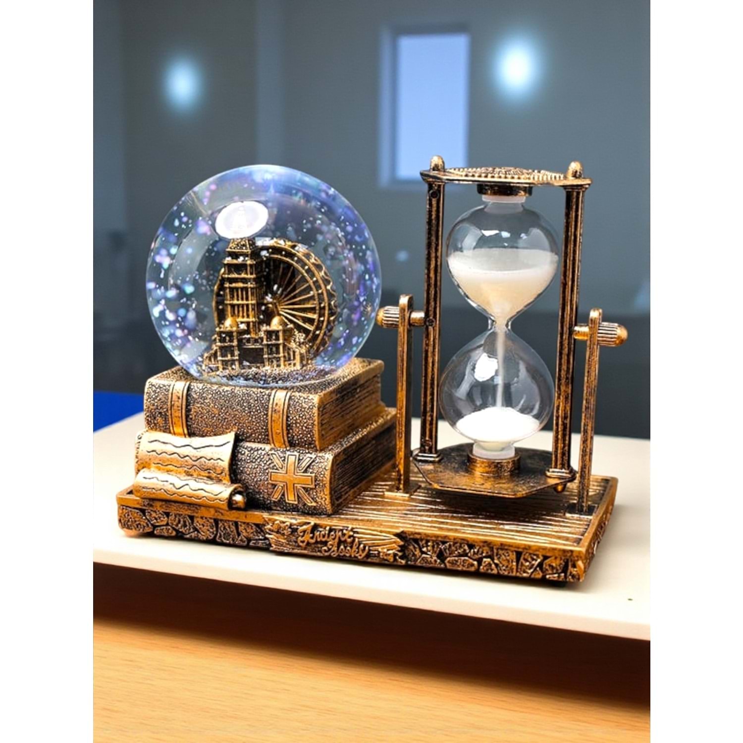 Çift Fonksiyonlu Tasarım: Hem zamanı takip etmeye yardımcı olan kum saati hem de sallandığında pırıltılı bir kar fırtınası oluşturan dekoratif bir küre sunar. (SEO: İkili Masa Dekoru, Kum Saati Kar Küresi)