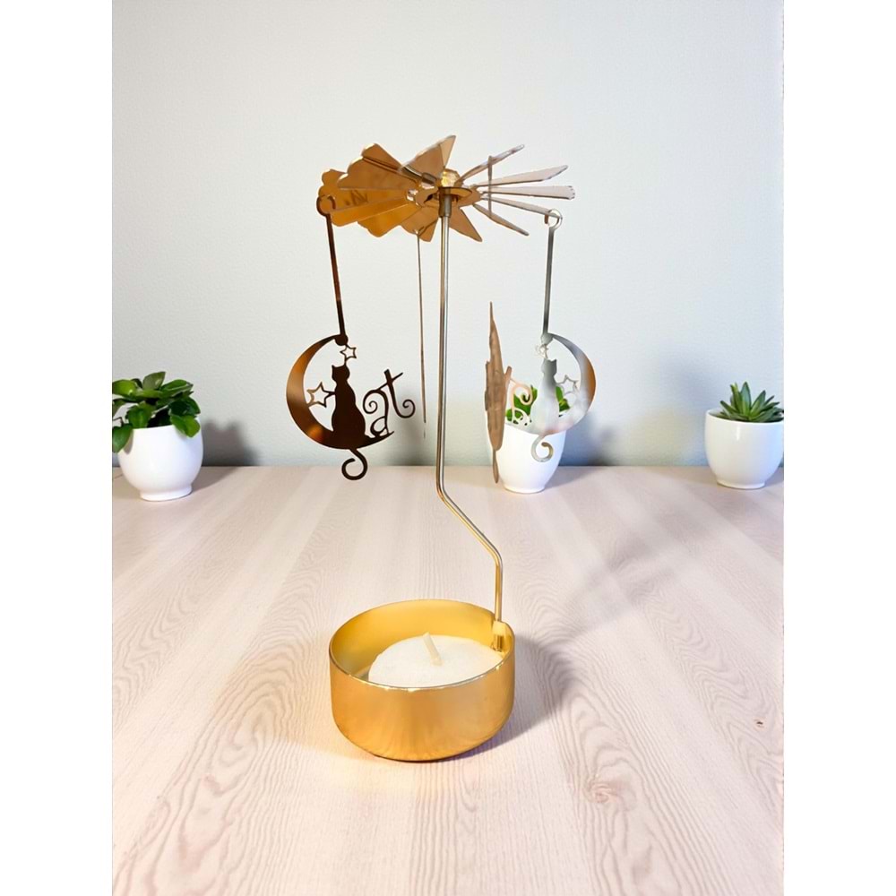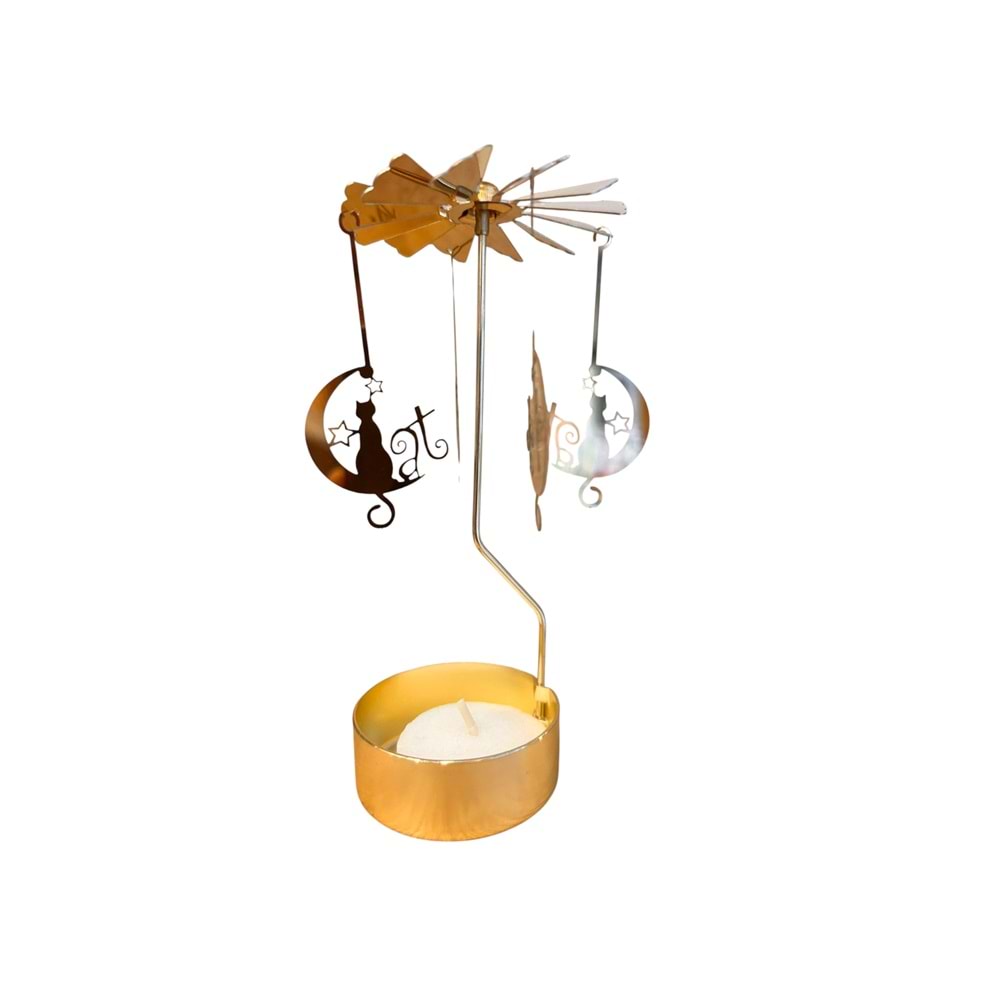 Mutlu Kedi tasarımlı altın renkli dönen metal mumluk, ısı ile dönen mekanizması sayesinde ortama neşe ve huzur katar. Dekoratif ve şık dilek çanı modeliyle evinize sıcak bir atmosfer kazandırın.(13 x 8 cm)