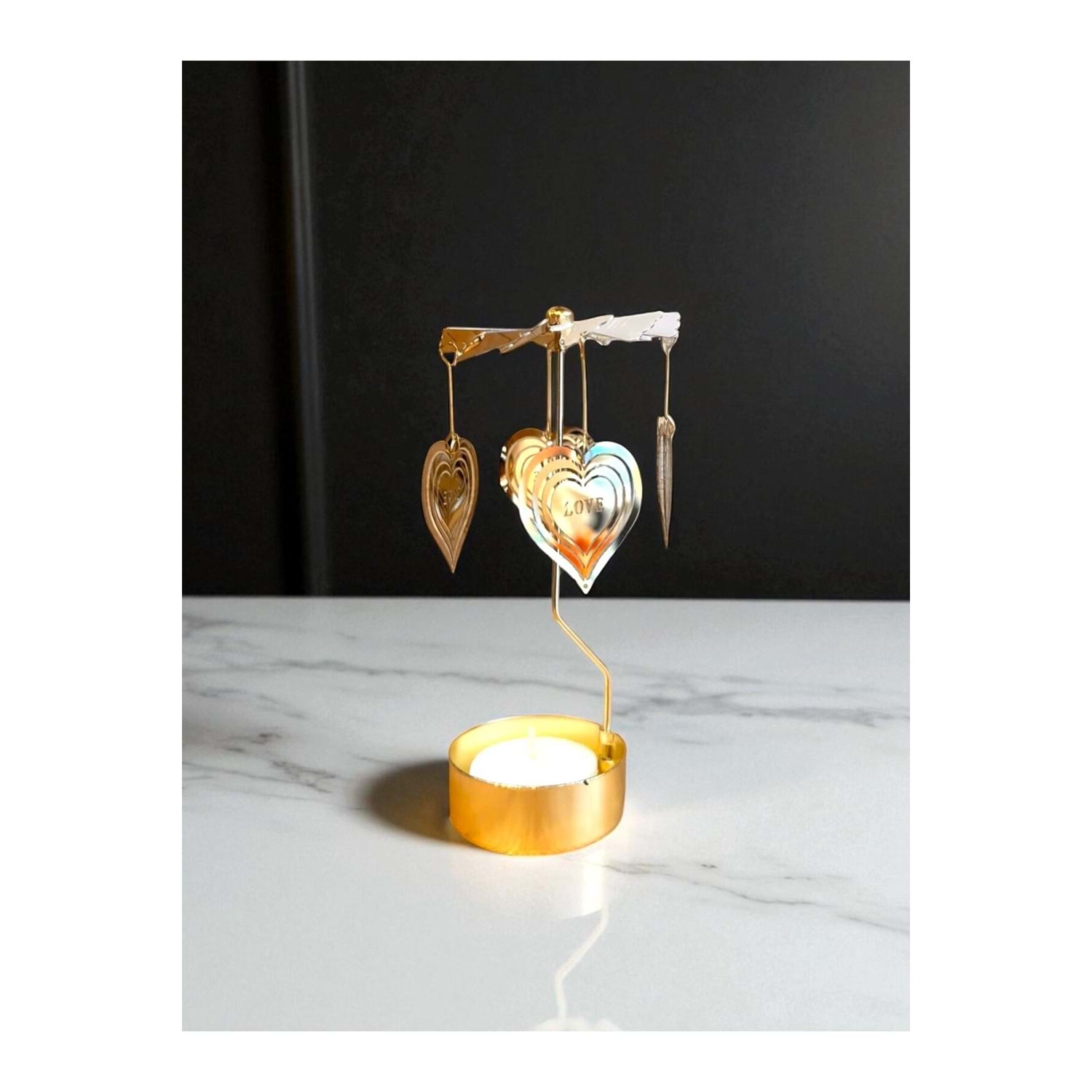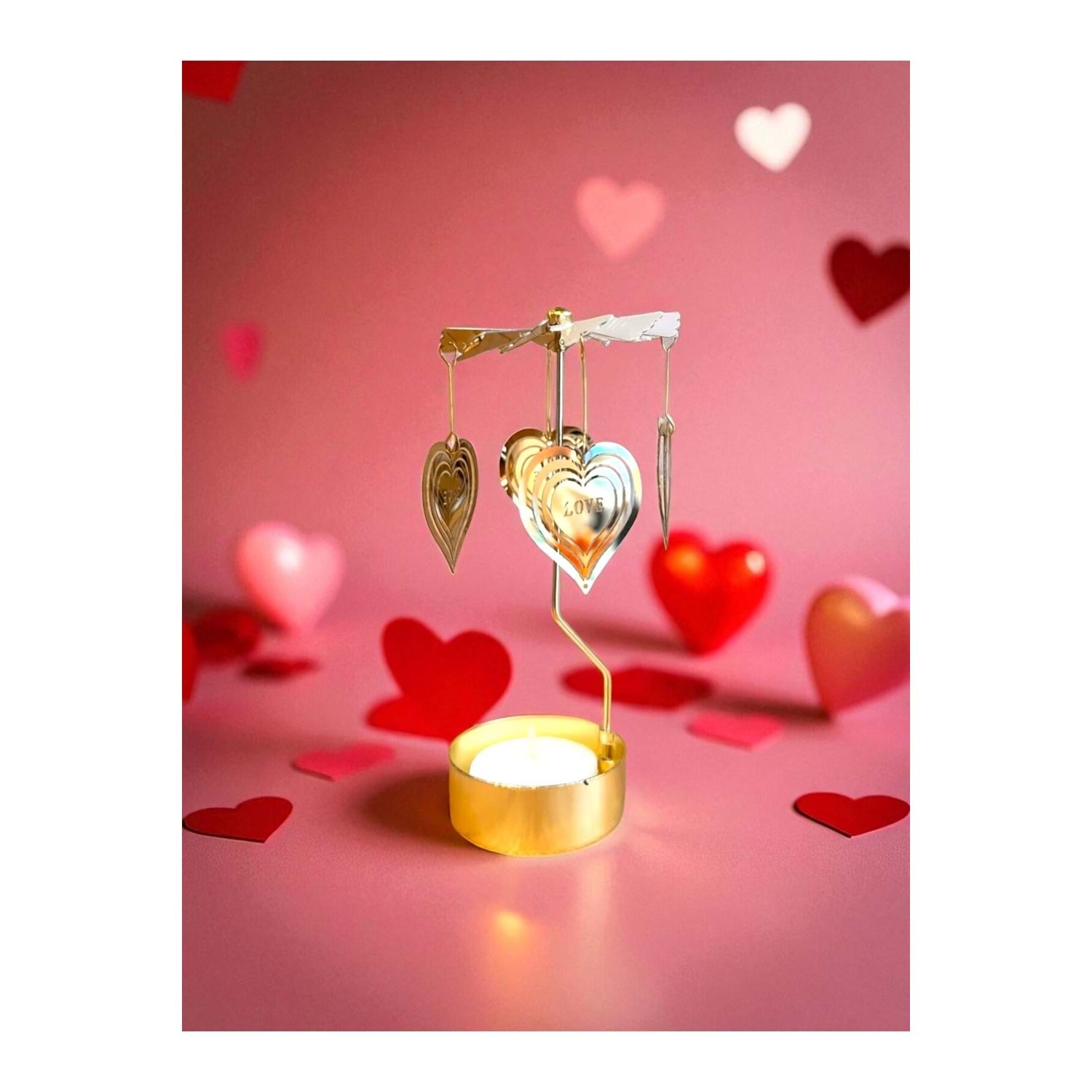 Isı İle Dönen Metal Kalp ve Love Mumluk – Altın Renk, Romantik Dekoratif Aksesuar