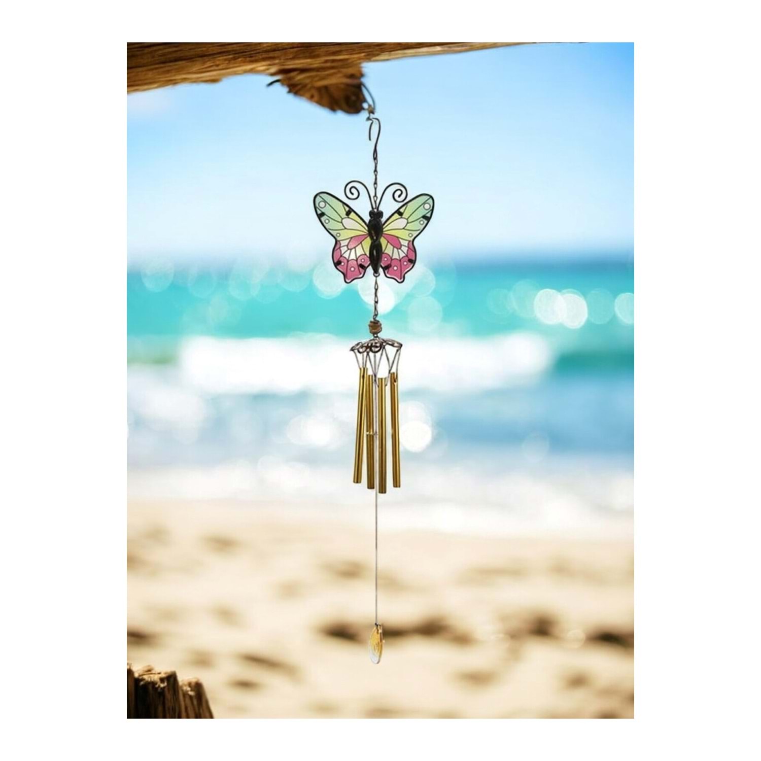 Altın Renkli Kelebek Tasarımlı Rüzgar Çanı Metal Ve Cam Malzeme Dekoratif Rüzgar Çanı