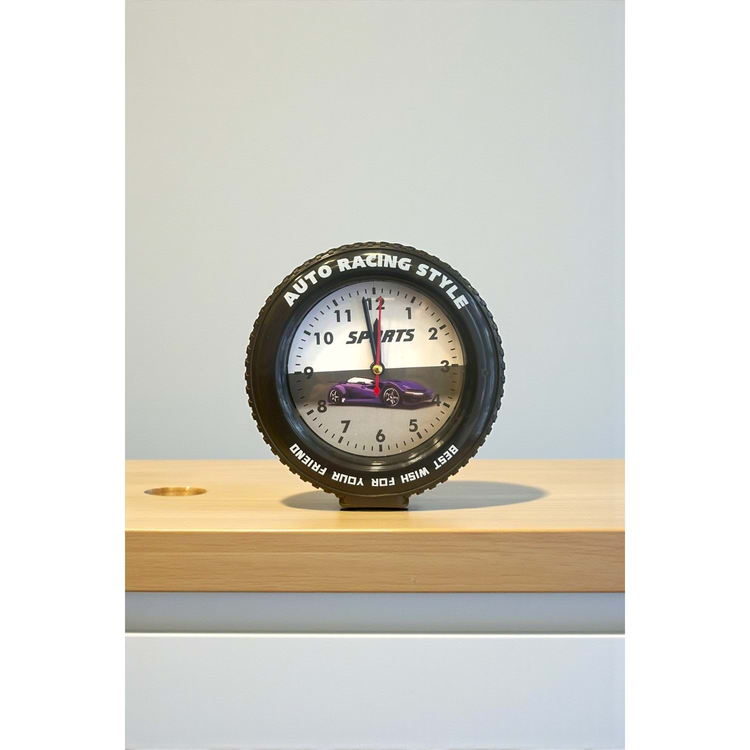 Lastik formundaki dış çerçevesiyle gerçek bir otomobil tekerleğini andıran bu saat, hem çocuk odaları hem de masa üstleri için dekoratif bir detay oluşturur.