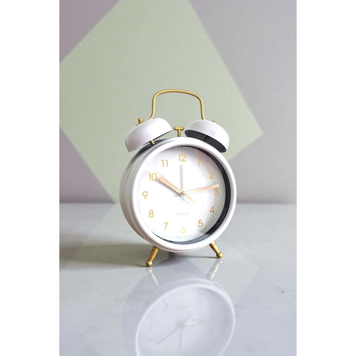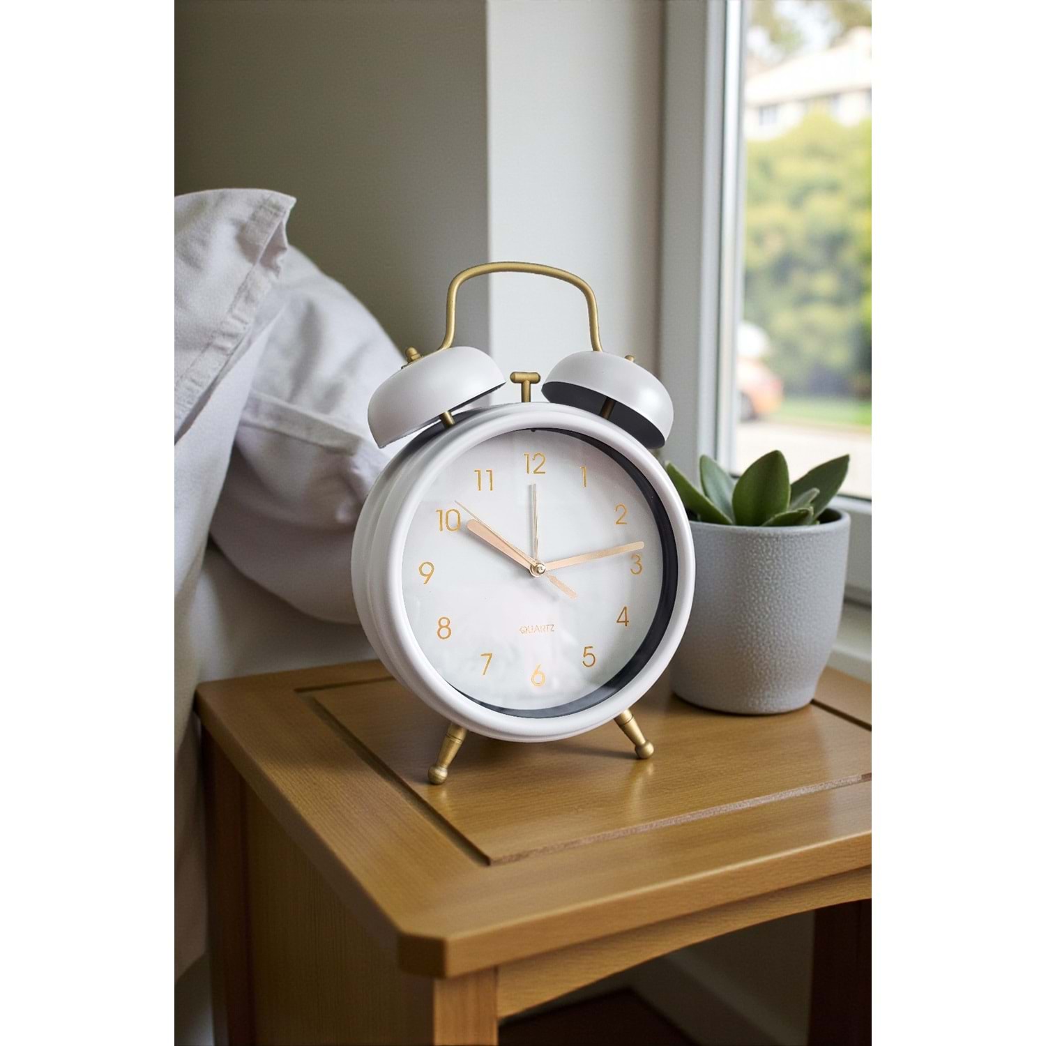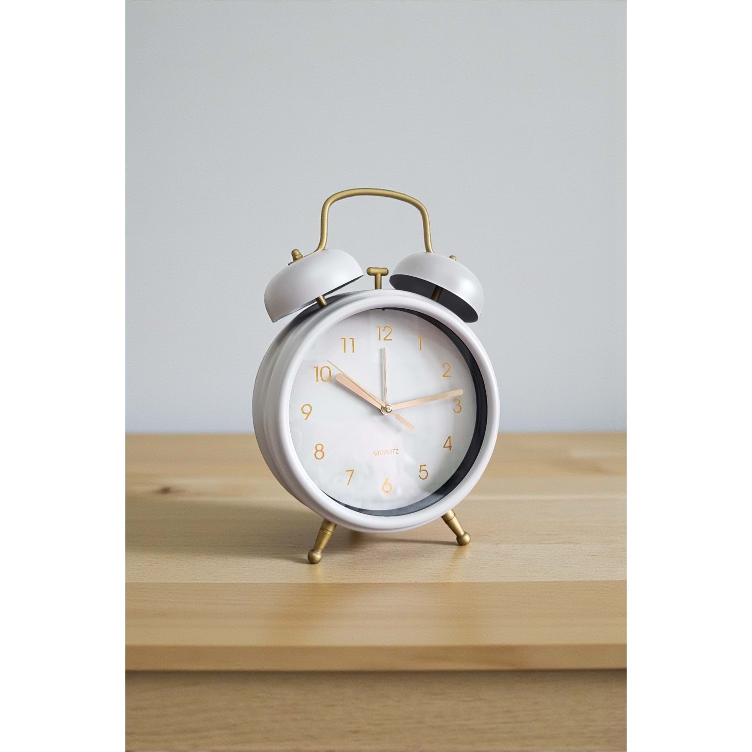 Klasik tarzda tasarlanmış bu masa üstü çalar saat, beyaz gövdesi ve altın detaylarıyla modern bir zarafet sunar. Şık tasarımıyla yatak odası, çalışma alanı veya ofis dekorasyonunuza sofistike bir dokunuş kazandırır.